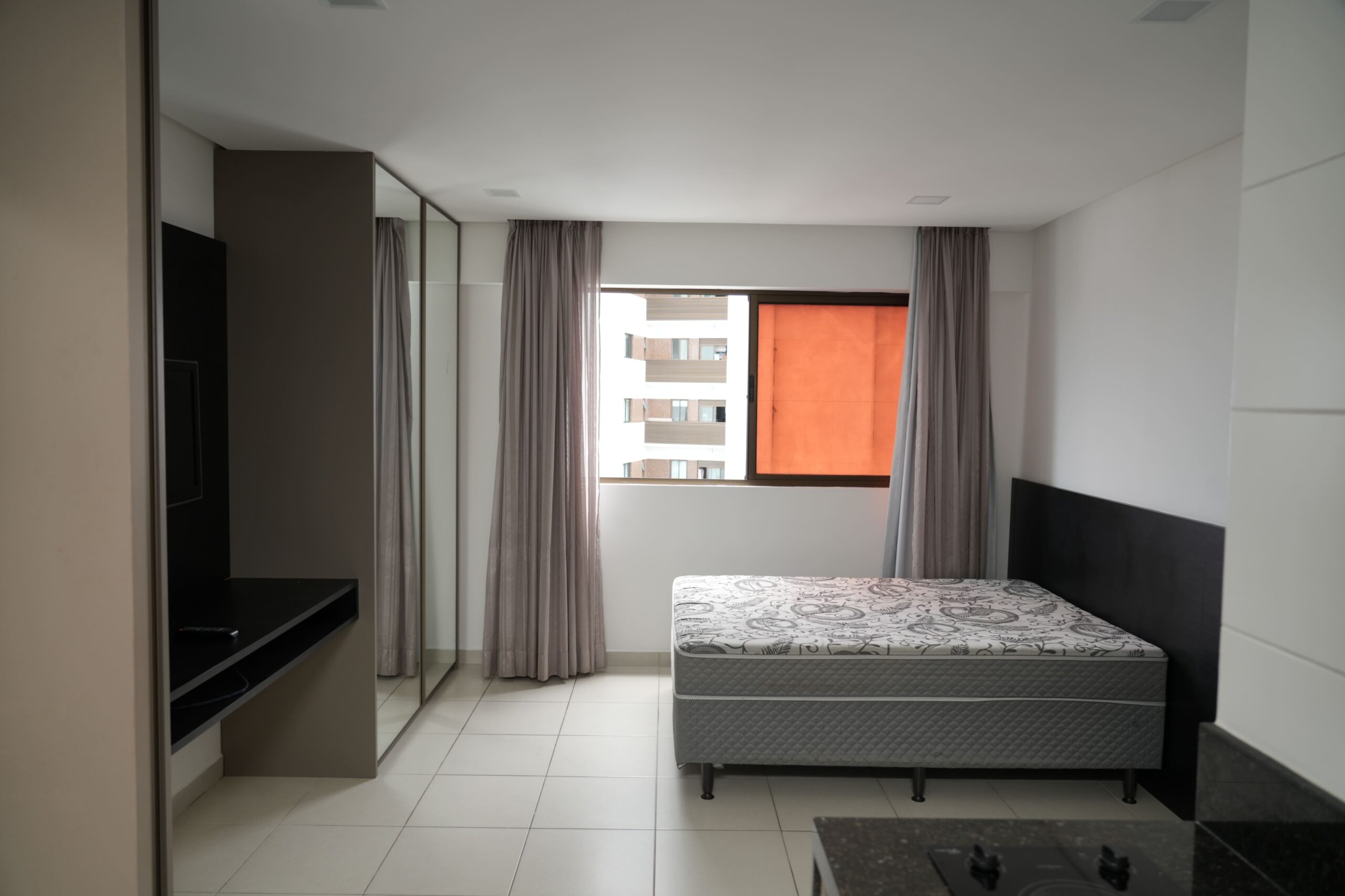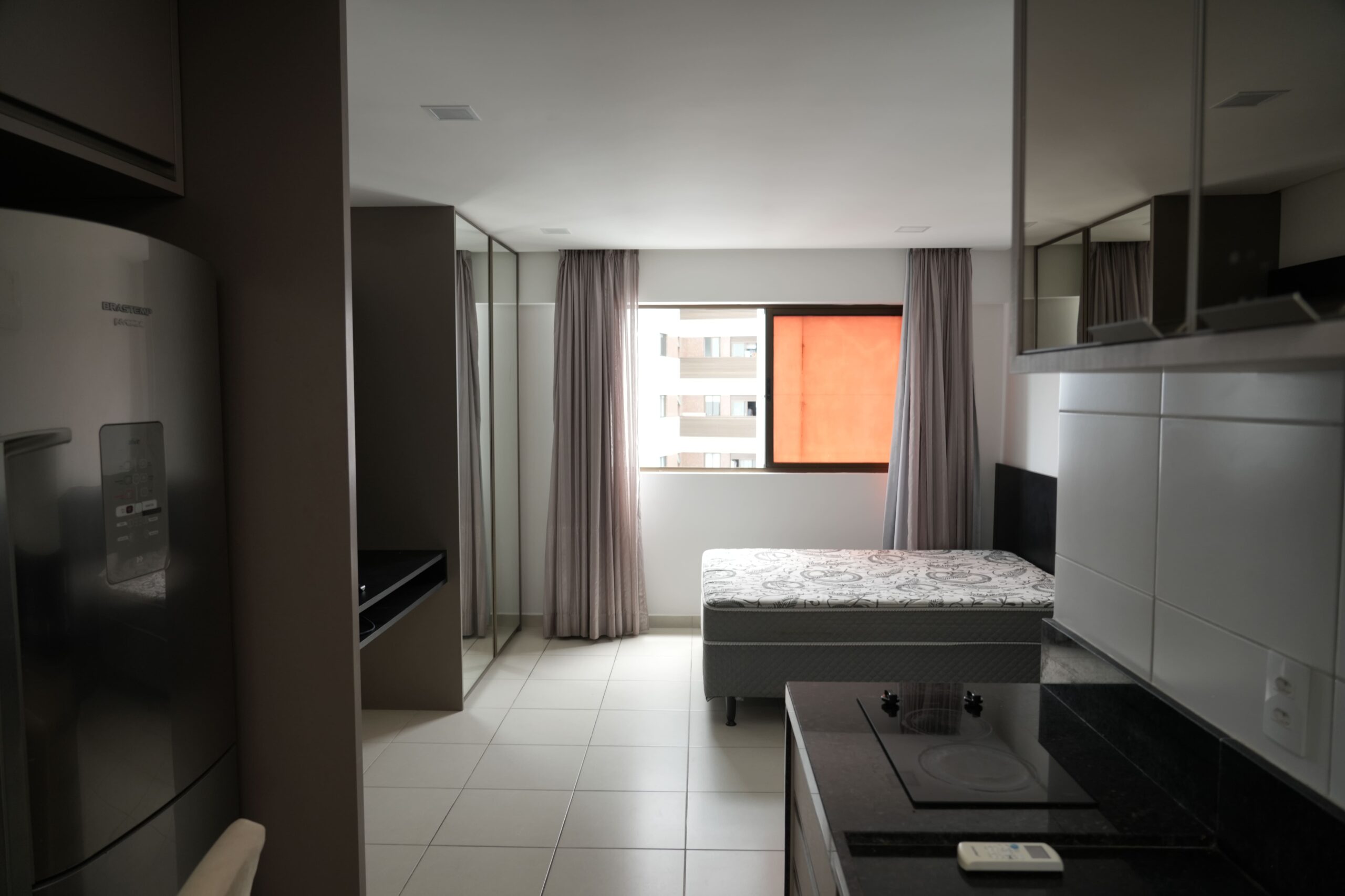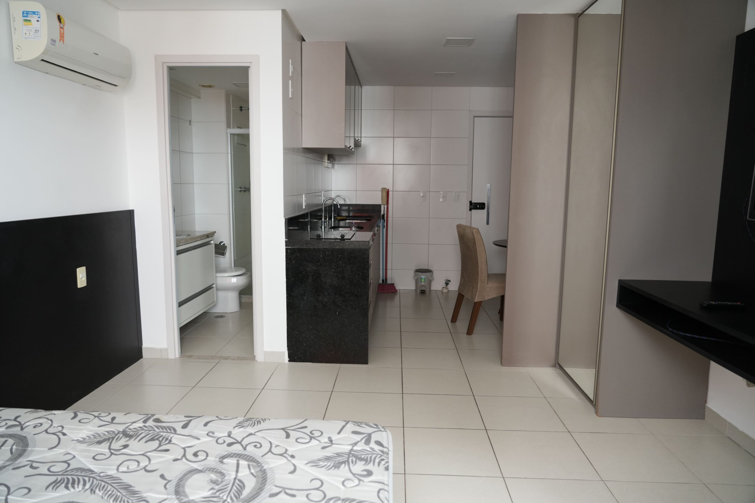 O imóvel é claro, ventilado e possui vista para o mar e para a cidade. A unidade está sendo entregue totalmente mobiliada, incluindo cama box casal, ar-condicionado, TV, mesa e cortinas. A cozinha é equipada com fogão elétrico, micro-ondas e geladeira. Conta ainda com fechadura eletrônica para maior praticidade e segurança.